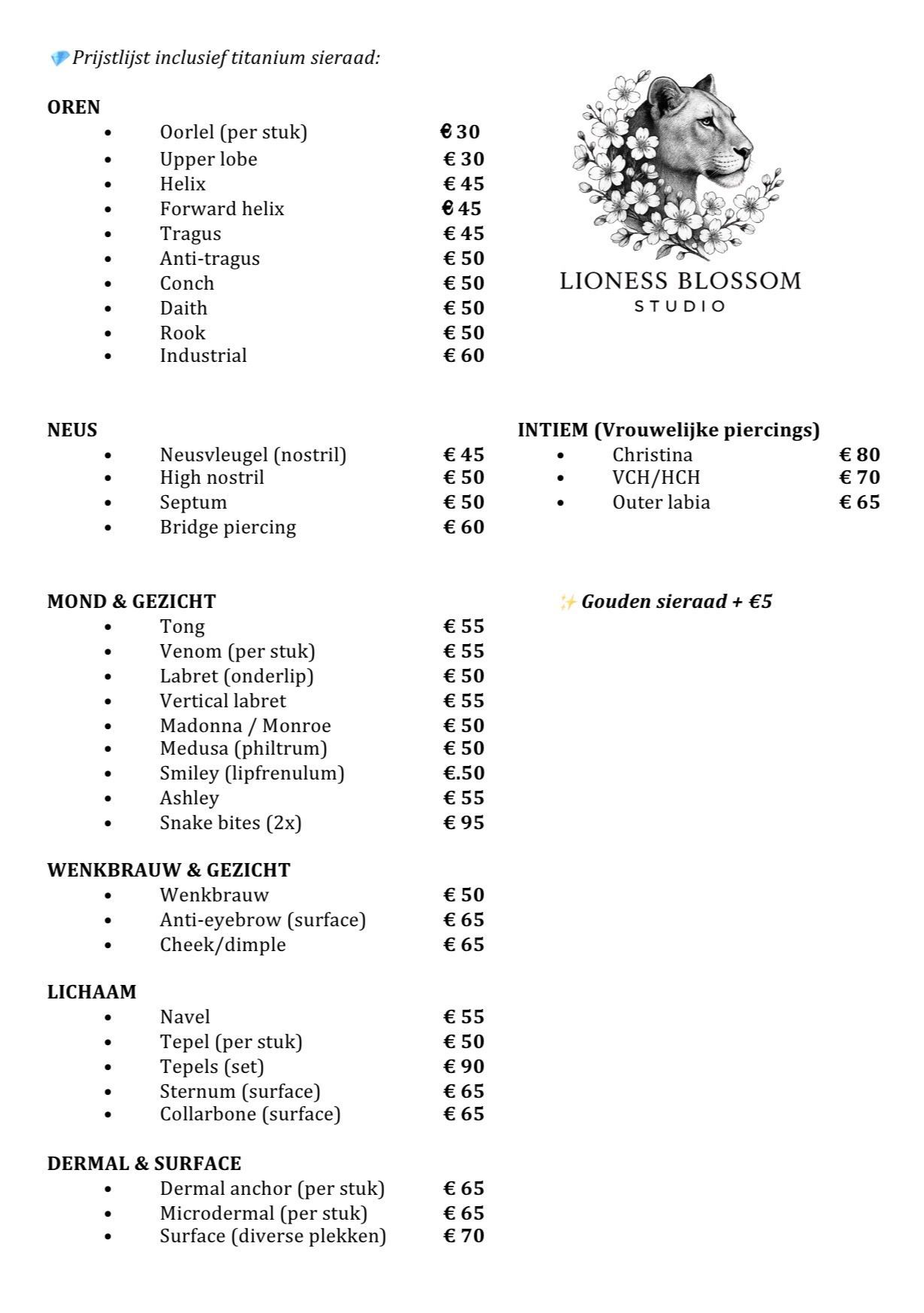 Bij Lioness Blossom Studio draait piercen niet alleen om het plaatsen van een sieraad, maar om een complete beleving. Onze piercers werken met precisie, aandacht en respect voor jouw lichaam. Of je nu voor iets subtiels gaat of een statement wilt maken: wij zorgen dat jouw nieuwe piercing perfect bij je past.