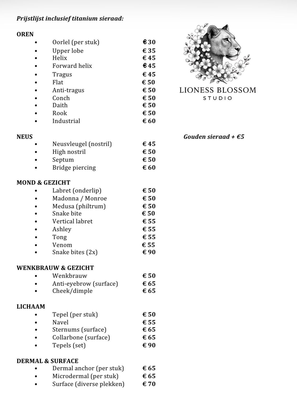 Bij Lioness Blossom Studio draait piercen niet alleen om het plaatsen van een sieraad, maar om een complete beleving. Onze piercers werken met precisie, aandacht en respect voor jouw lichaam. Of je nu voor iets subtiels gaat of een statement wilt maken: wij zorgen dat jouw nieuwe piercing perfect bij je past.